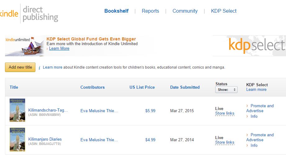 This is a topic you can worry yourself sick over. But don’t, it’s not worth it. Amazon makes this easier for us in one way, in that it gives us a range in which we earn 70% royalties (which, by the way, you get nowhere else in publishing). That’s between $2.99 and $9.99. Outside of that, you only get 30%. Another no-brainer – we will price our book between those numbers. But where exactly? Again, go online and check the competition. Look at other Kindle books, preferably in your genre, books that you’d like to compete with, and see where they are priced. If anything, stay at the lower end of the range, but don’t give it away too cheap. I don’t know about you, but a very cheap book, to me, doesn’t look serious. Then again, you shouldn’t try to sell a short story of, say, less than 20,000 words for $9.99, so the length of your book also plays a role. Kilimanjaro Diaries is about 73,000 words long, which makes for about 250 pages in a paperback (remember, Kindle books don’t have page numbers), and I first sold it for $3.99. I’ve since increased it to $4.99.